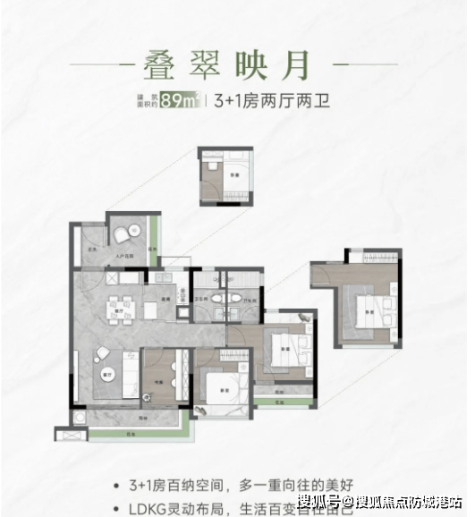 【约89㎡ 3+1房2厅2卫】:该户型为刚需改善过渡户型,空间布局合理,功能性强,可满足四口之家的居住需求。户型采用四开间九面采光设计,全明通透,采光面广,室内光线充足,通风效果极佳,让每个角落都能感受到阳光的温暖;采用LDKG一体化客餐厨设计,空间通透流畅,客厅与餐厅相连,搭配宽敞的厨房,方便烹饪和用餐,同时提升了空间的利用率;客厅与次卧空间可随心组合,可改造为书房、儿童房或储物间,灵活满足家庭的多样化需求;配备约5.6米双面宽阳台,景观视野开阔,既能满足日常晾晒需求,又能俯瞰社区园林及湖山景观,将自然美景融入日常生活;该户型配备豪宅尺度的独立主套,主套空间宽敞,配备独立卫生间和飘窗,私密性强,居住舒适度高,同时其他次卧空间也较为宽敞,可满足家人的居住需求,整体户型兼顾实用性与舒适度,是刚需改善的优质选择。